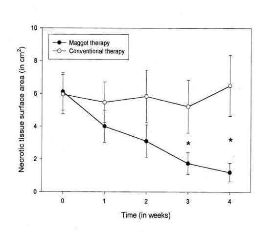Maggot vs conservative (control) debridement therapy for pressure ulcers. Average surface area (sq cm) of necrotic tissue for wounds treated with maggot therapy (solid circles; n=43) decreased faster and greater than that seen with conventional therapy (open circles; n=49). Error bars indicate standard error; asterisks indicate significant differences in mean surface area (p<0.05) within 3 weeks. Sherman RA: Wound Repair Regen 2002; 10:208-14