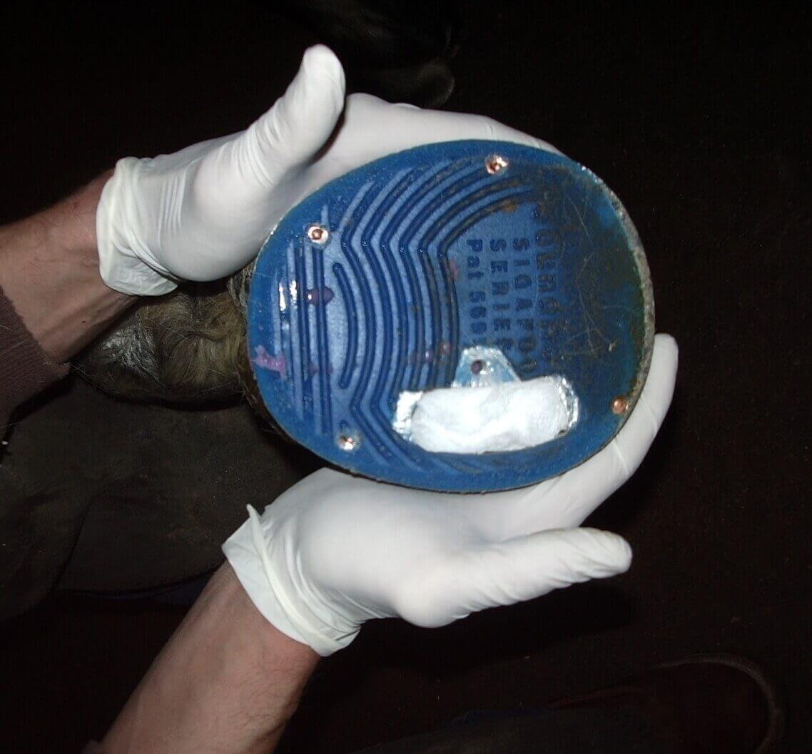 The maggots have good access to necrotic tissue – Usually we are doing some degree of debridement prior to application of the maggots. Depending on the case this can range from a small hole in the sole of the foot to debridement of the third Phalanx. In the case of severe infections that communicate with the distal interphalangeal joint or the navicular bursa, a surgical drain can be placed and the maggots/dressing are placed at the egress of the drain. If the horse has a cast placed over the site of infection, due to instability of the hoof or distal interphalangeal joint, a small access hole is cut in the cast so the maggots can be placed and the gauze can be changed. In cases where foot casts are employed the maggots do an excellent job at keeping infection inside the cast under control.
